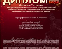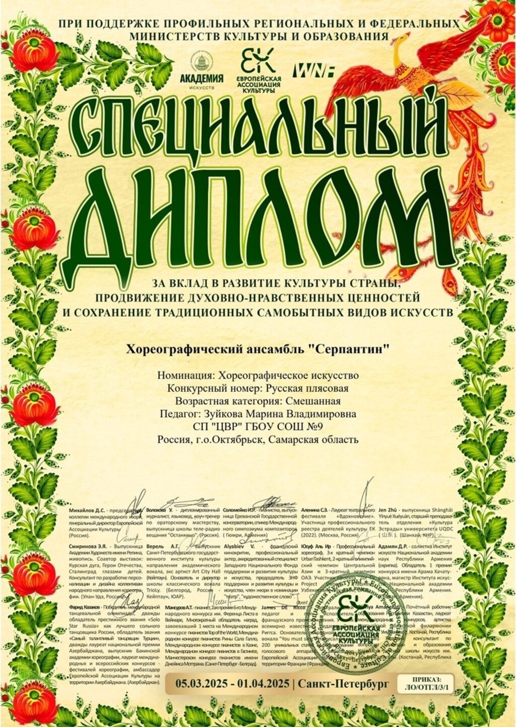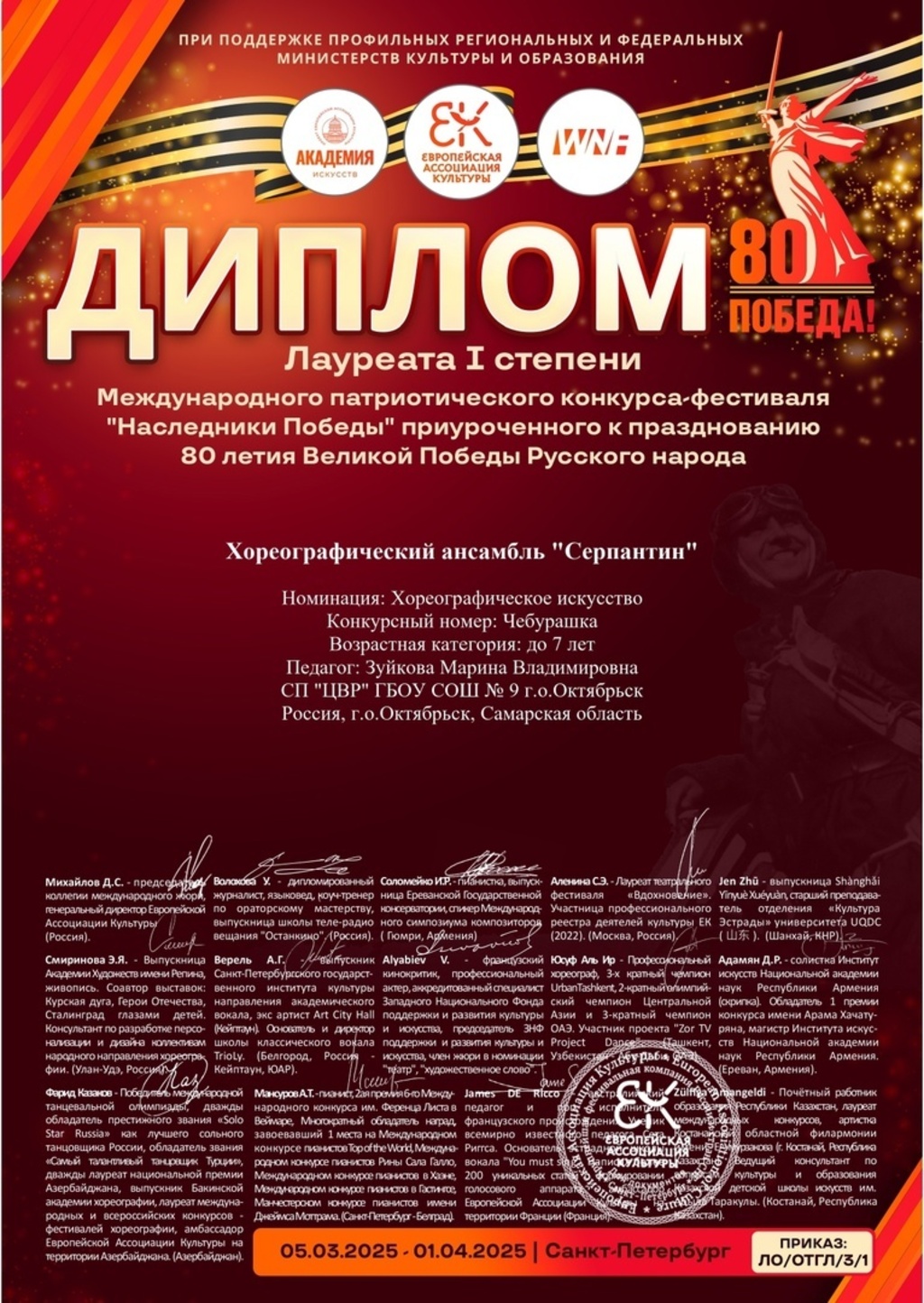Дипломами лауреата 1 степени в Международном патриотическом конкурсе-фестивале "Наследники Победы", приуроченном к празднованию 80-летия Великой Победы Русского народа, а так-же Специальным Дипломом за вклад в развитие культуры страны, продвижение духовно-нравственных ценностей и сохранение традиционных самобытных видов искусств, награждены участники хореографического ансамбля "Серпантин" Центра внешкольной работы городского округа Октябрьск .