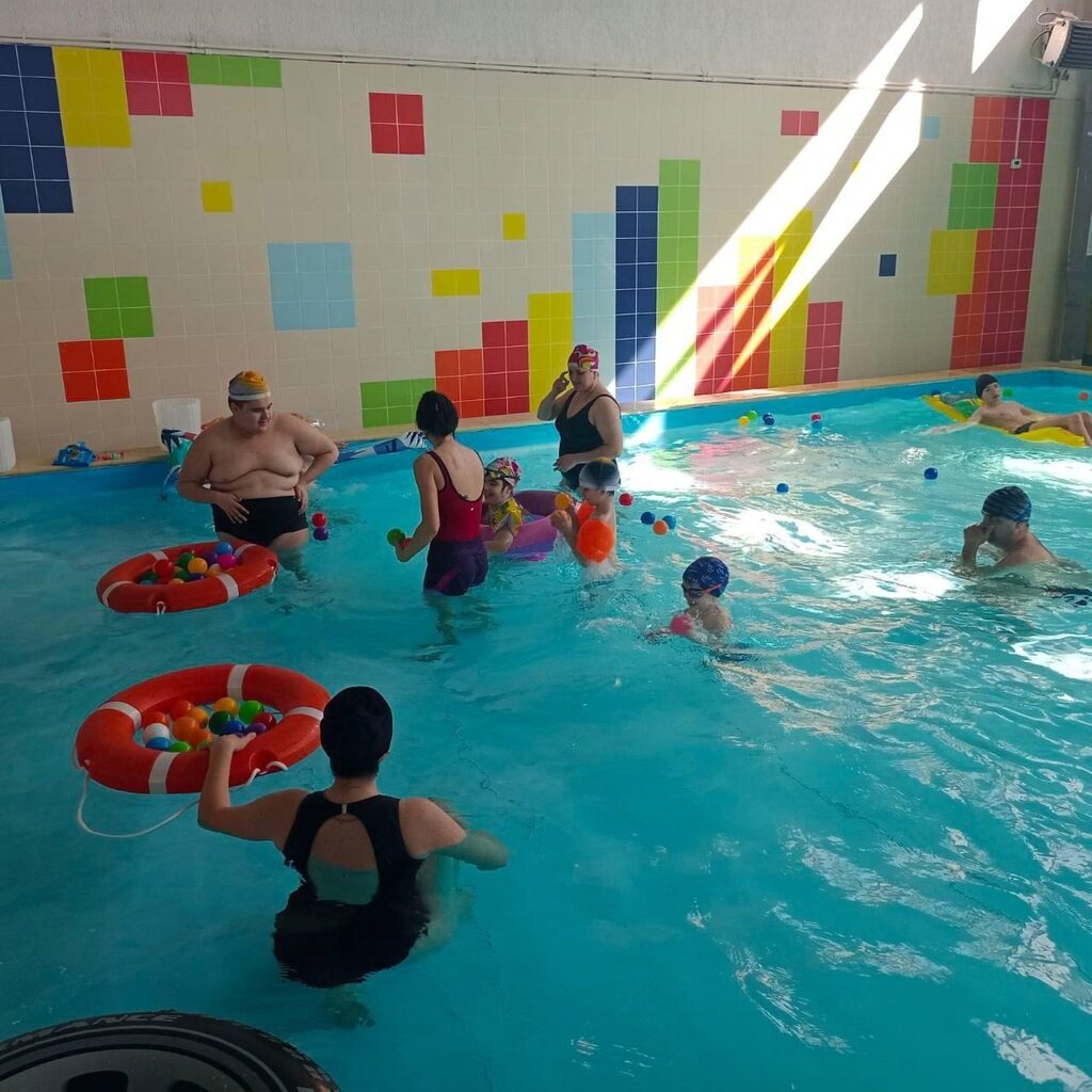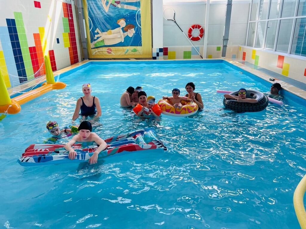 Ребятам провели разминку в воде с аква-гантелями, устроили соревнования с плавательными досками на перегонки, поиграли в волейбол, собирали разноцветные шарики, ныряли за тонущими предметами