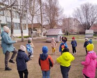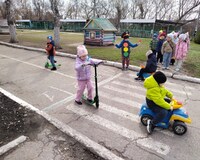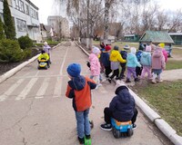На свежем воздухе, на прогулочной площадке, в условиях, приближённых к реальным, воспитатель отрабатывает с детьми навыки безопасного перехода дороги по пешеходному переходу.
