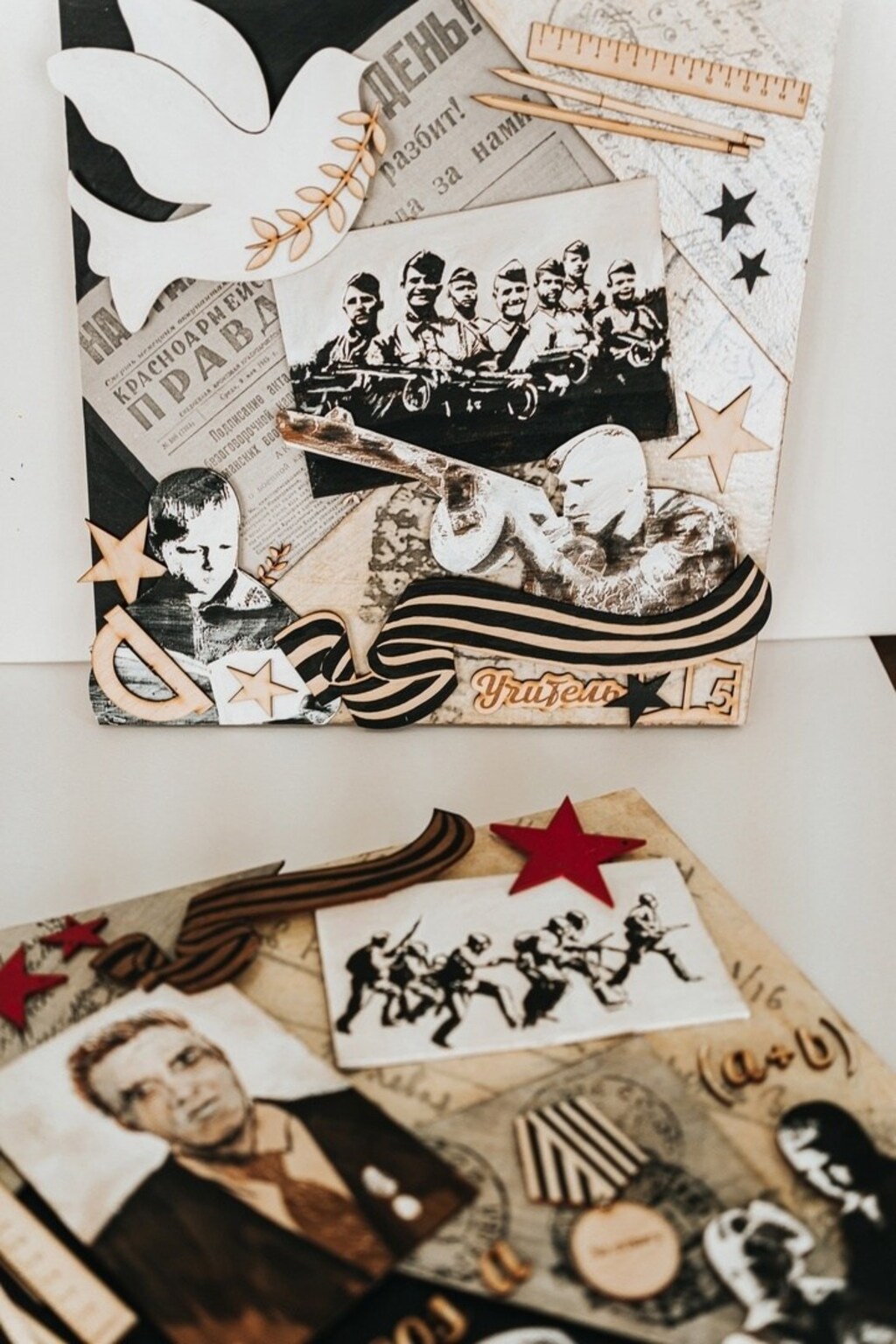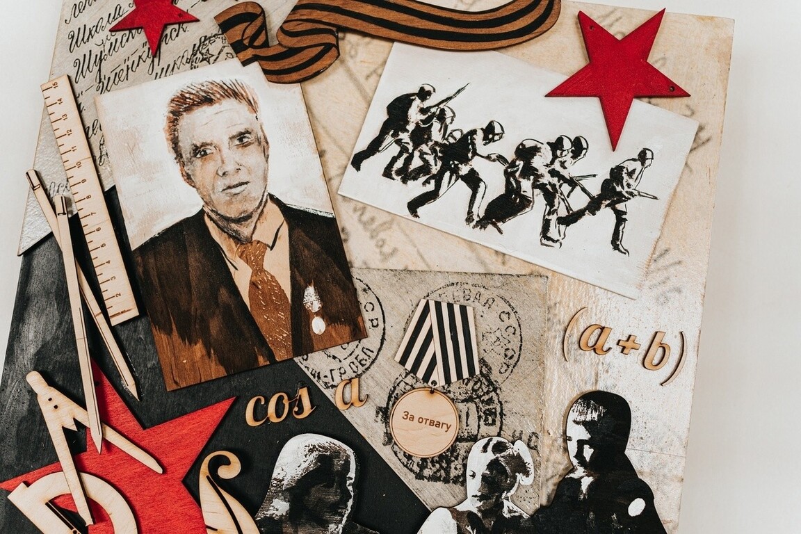 Каждый педагог делал работу в своей оригинальной технике с использованием необычных материалов, через картину рассказав о боевых подвигах учителей их воинских специальностях и школьных предметах, которые они преподавали.