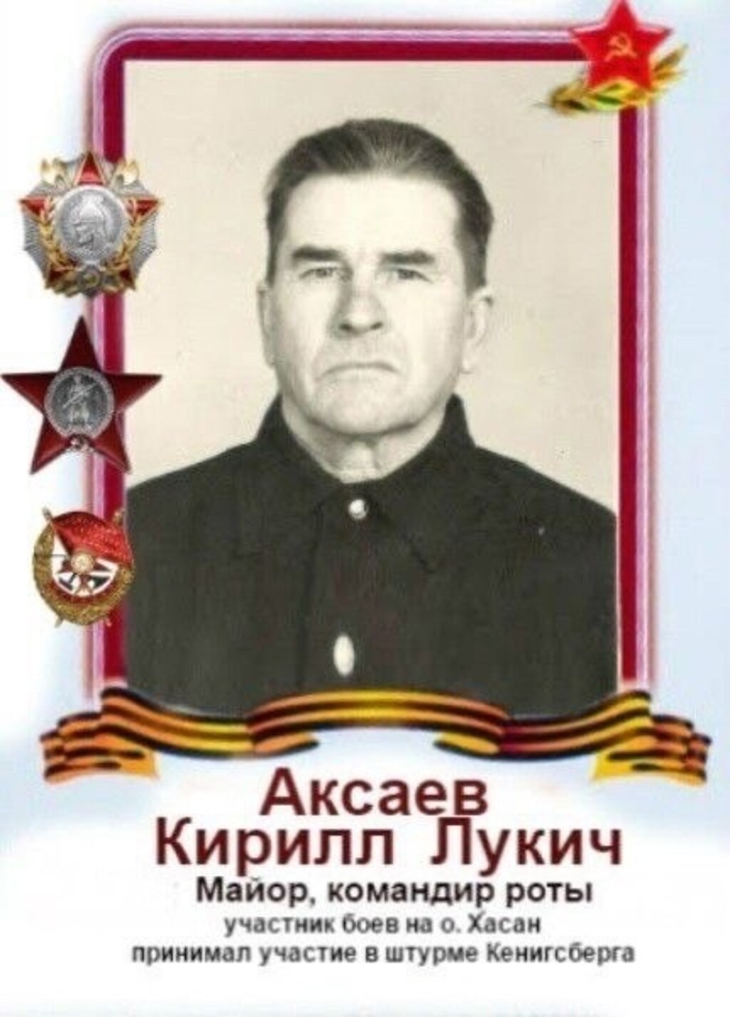 В первых же ожесточенных боях часть наших советских командиров была выведена из строя. Кирилла Лукича назначают командиром взвода. Но в этой должности он пробыл только одни сутки. Сутки беспрерывных боев в ходе которых он показал себя инициативным и храбрым командиром. На следующий день Аксаев уже лейтенант, командир стрелковой роты. В боевых условиях это большая ответственность. Обхитрить противника, нанести ему тяжкий урон и в то же время, сохранить своих людей - это значит выиграть бой, что в конечном счёте и требуется от командира роты. Ему это удавалось: помогала военная выручка, приобретения при прохождении действительной службы, при событиях на озере Хасан.