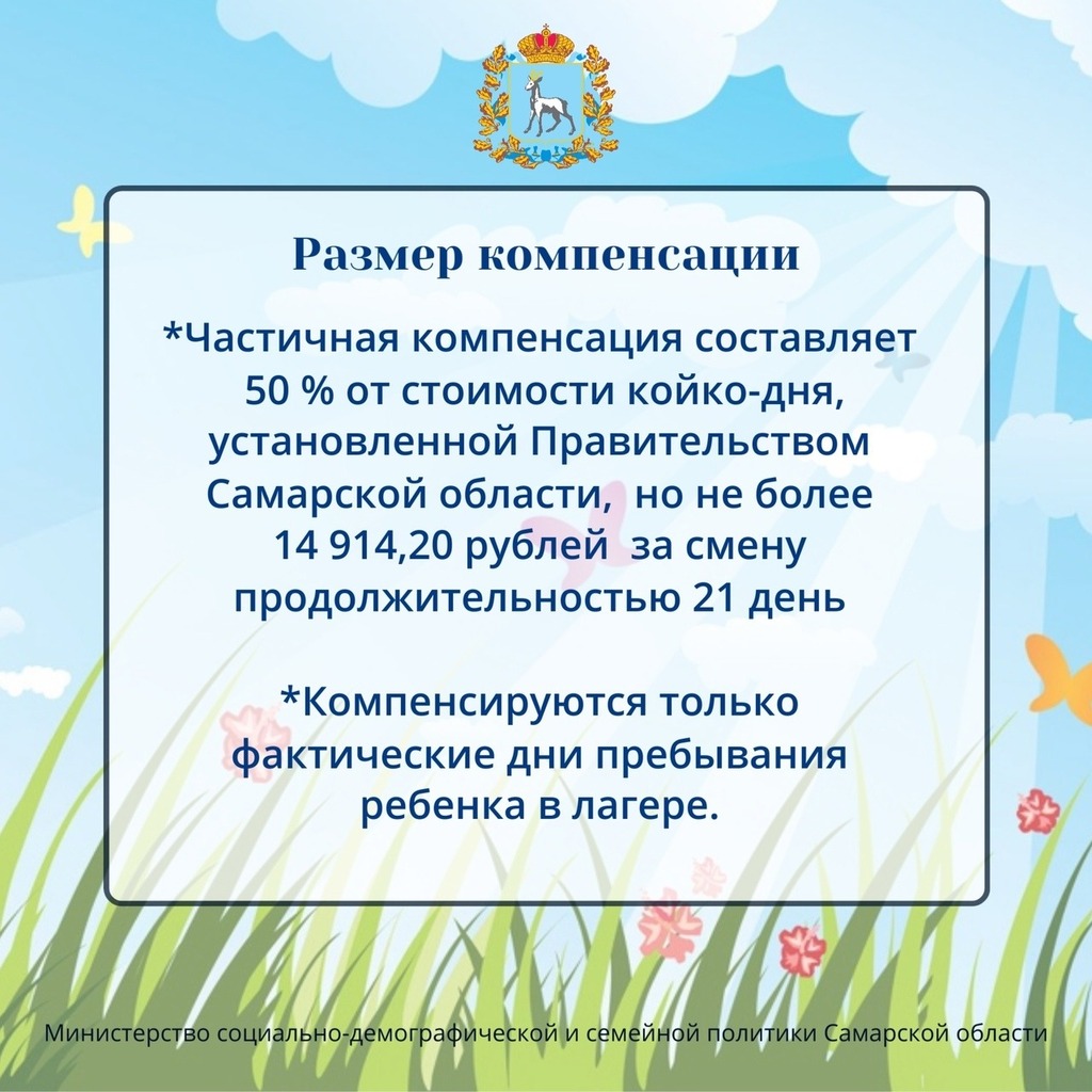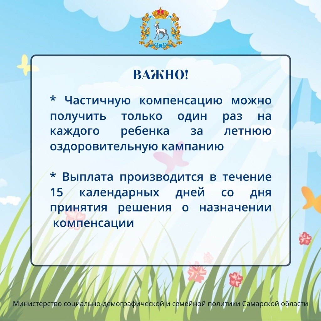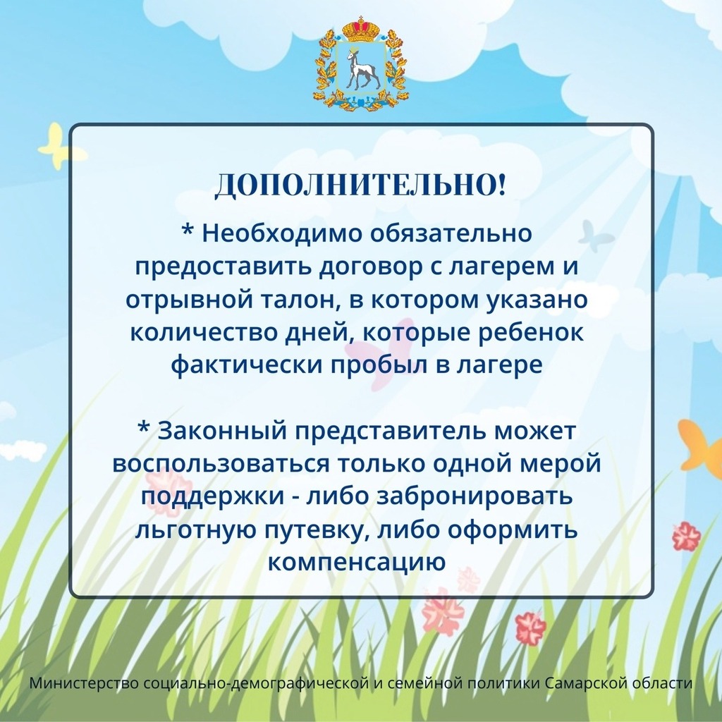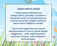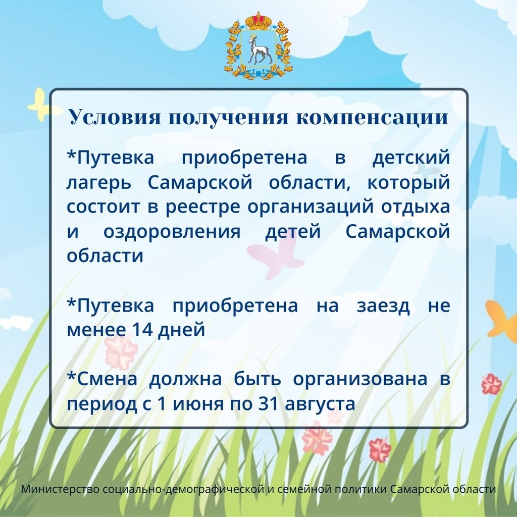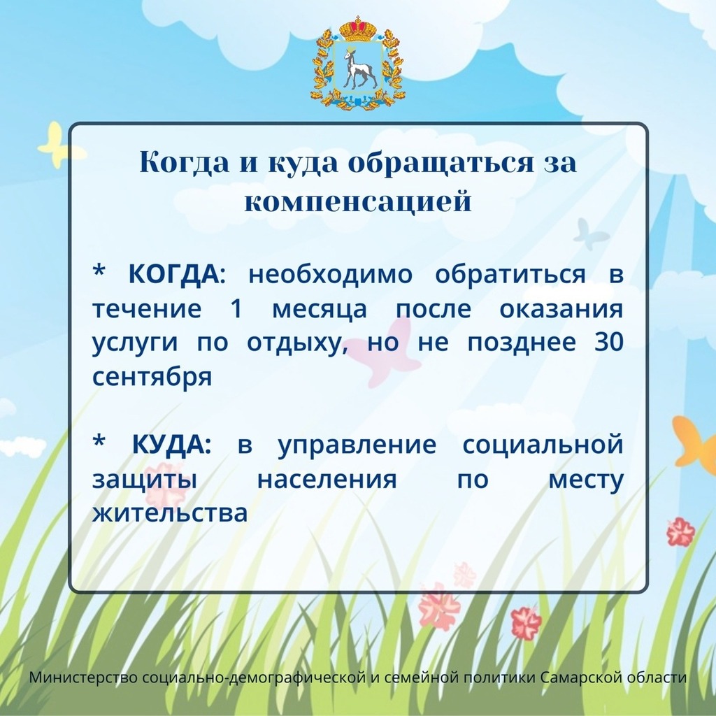 В карточках Минсоцдемографии Самарской области говорится подробно о том, как оформить компенсацию за самостоятельно приобретенную путевку в летний оздоровительный лагерь.