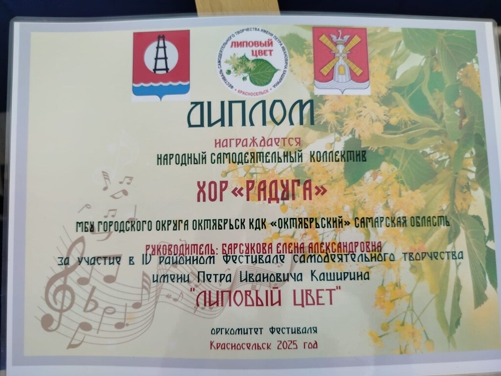 Народный самодеятельный коллектив хор "Радуга" принял участие в Районном Фестивале самодеятельного творчества имени Петра Ивановича Каширина "Липовый цвет". Своими выступлениями участники коллектива продемонстрировали высокий уровень мастерства и исполнительского искусства и были награждены дипломом.