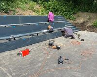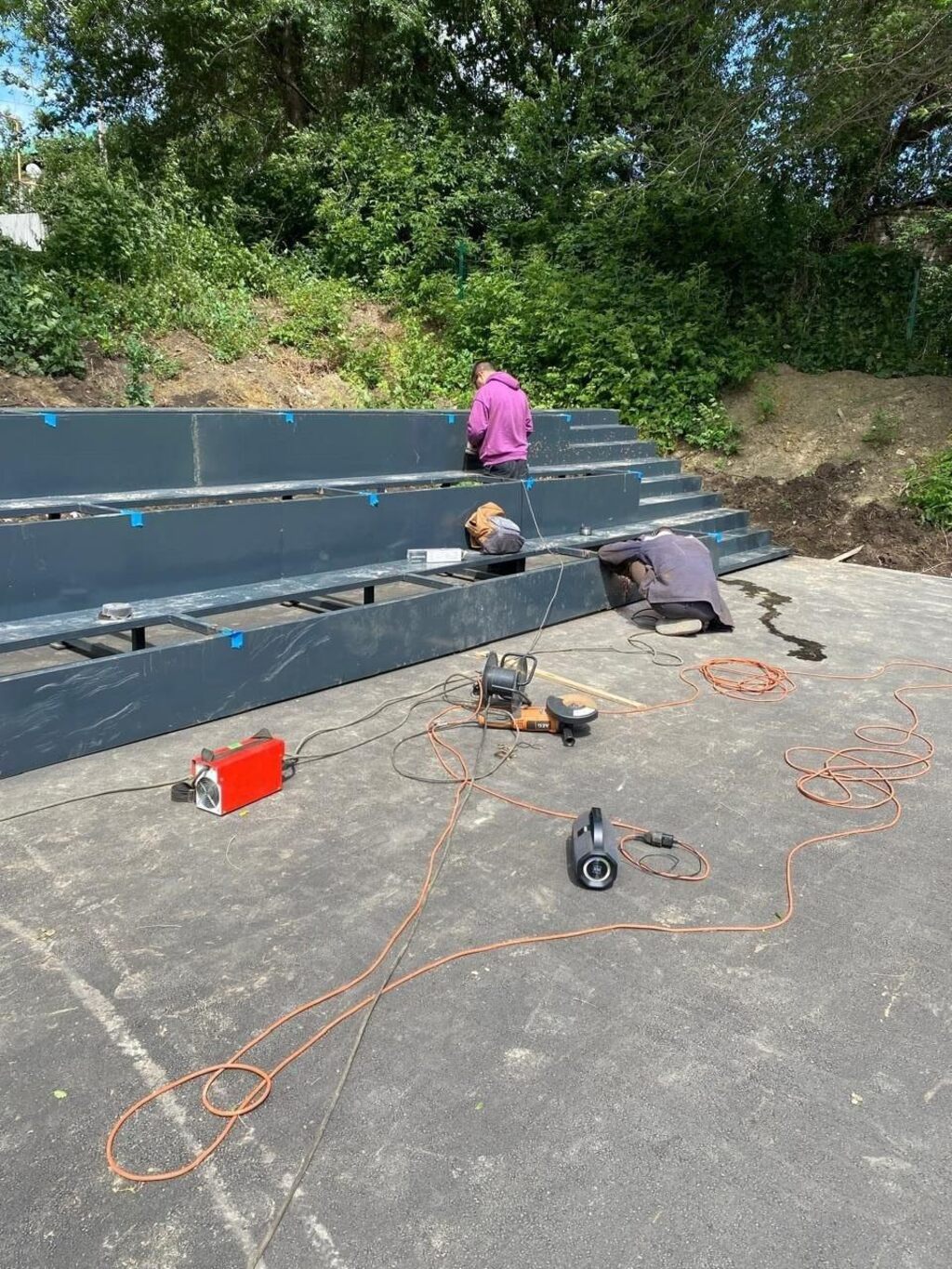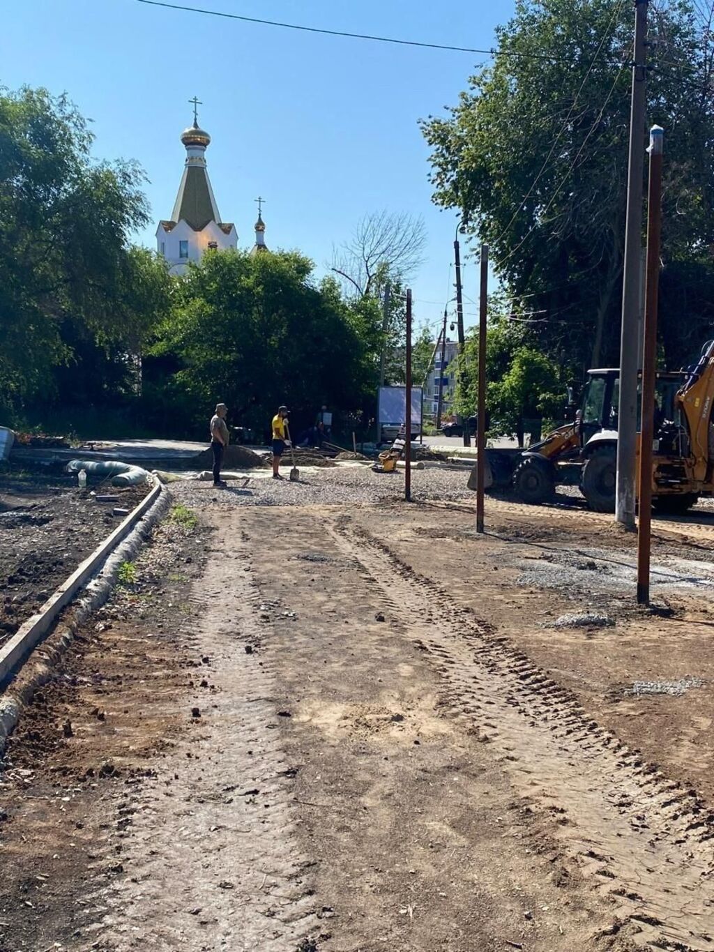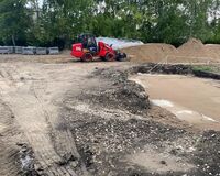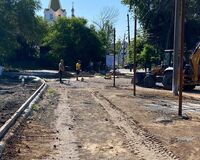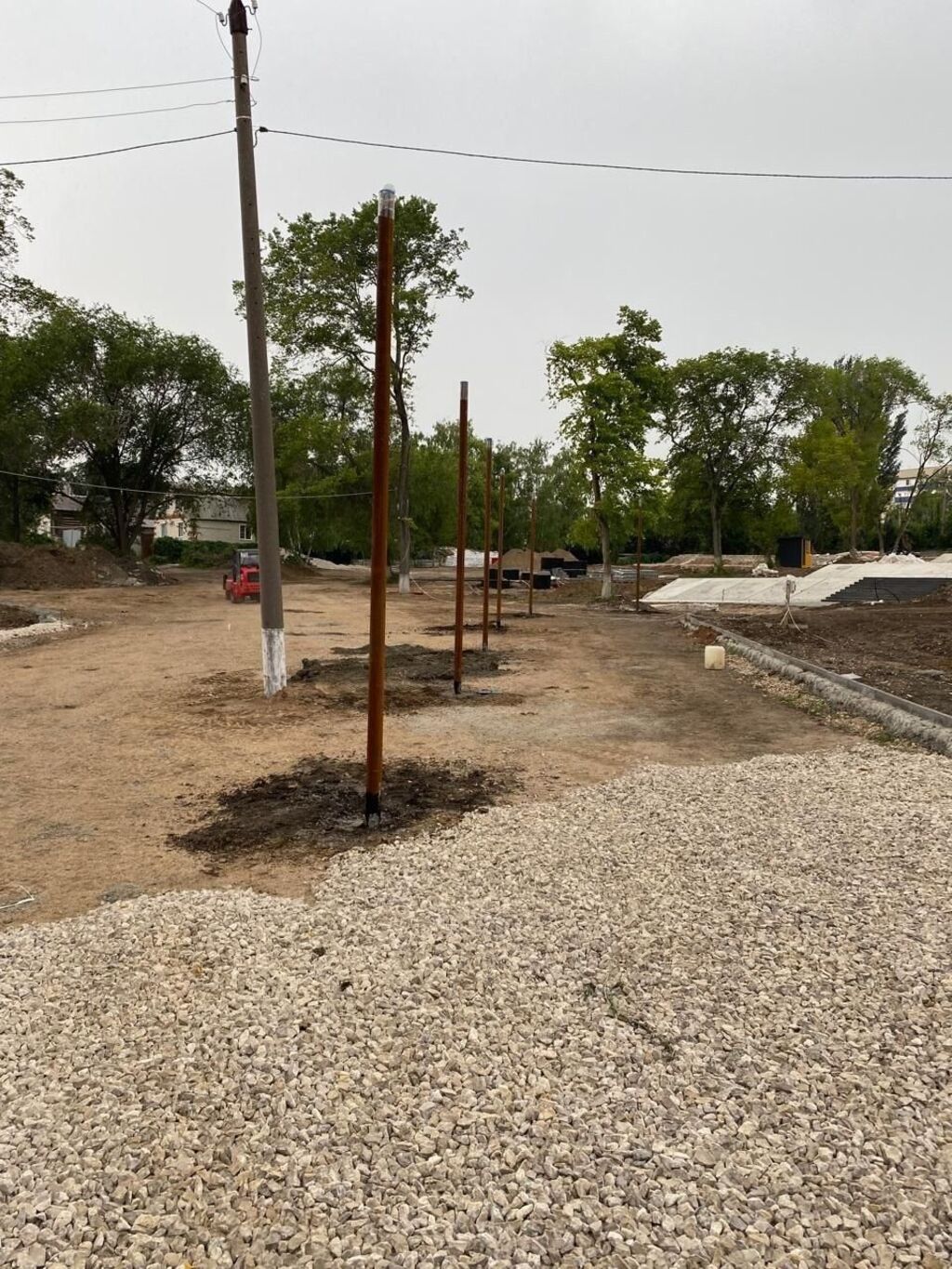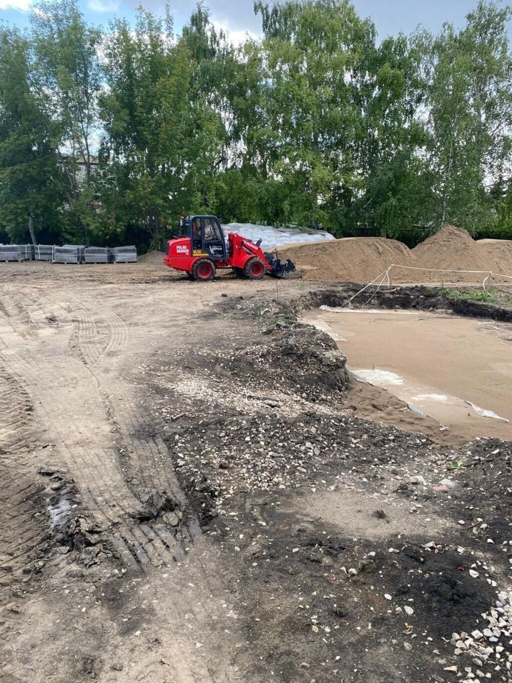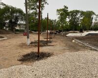 Подрядчик убирает старое ограждение, готовит основание под установку бортового камня и укладку брусчатки. Приступил к обустройство будущей площадки для йоги. Продолжается строительство техпомещения для фонтана.