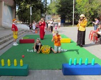 Поздравить школьников с началом нового учебного года пришли и сказочные герои – лиса Алиса, кот Базилио и, конечно же, озорной Буратино – вместе с которыми ребята соревновались в весёлой эстафете, проводили флеш моб по правилам дорожного движения, надували шарики, учились правильно приветствовать друг друга.