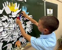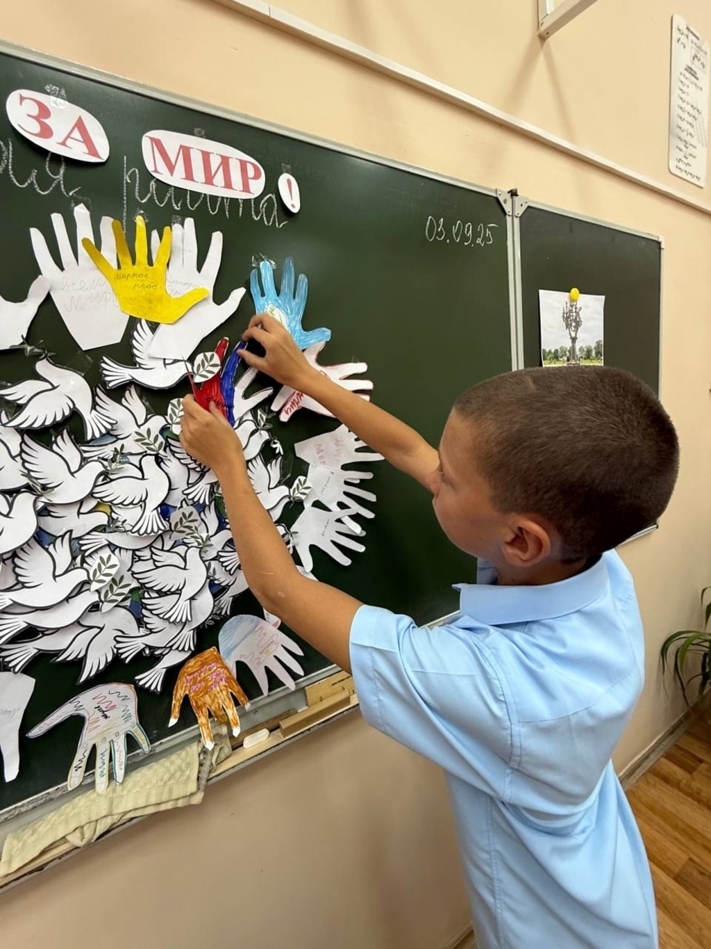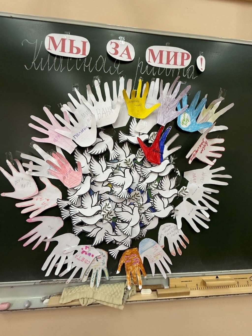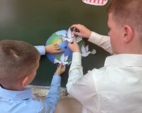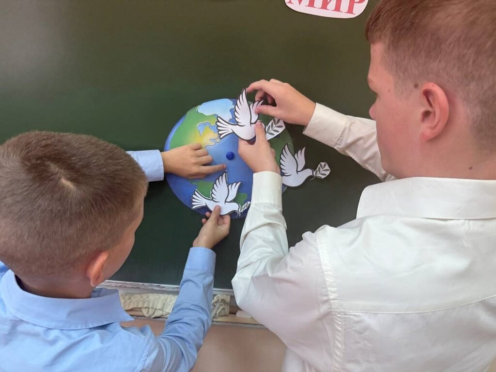 В ходе урока ребята также узнали о выражении «голубь мира». Оно стало популярным после окончания Второй мировой войны, когда эмблемой Всемирного конгресса сторонников мира, проходившего в 1949 году в Париже и Праге, стал белый голубь с оливковой ветвью в клюве, нарисованный Пабло Пикассо. Дети своими руками изготовили макет нашей планеты, внутри которого разместили символы мира и человеческой доброй воли — белых голубей. Каждая птица олицетворяет надежду на светлое будущее! Эти символы мира органично дополнили оттиски детских ладоней, вырезанные из бумаги. Ладони, бережно обрамляющие Землю, создают многогранный образ: это и защитный барьер, оберегающий хрупкий мир, и открытость объятий, символизирующая готовность к дружбе и сотрудничеству, и, конечно, прямое участие каждого человека в сохранении нашего общего дома.