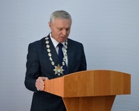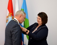 Вновь избранный Глава городского округа принёс торжественную присягу. Председатель Думы г.о. Октябрьск Е.В. Шальнова вручила ему знак Главы городского округа Октябрьск.