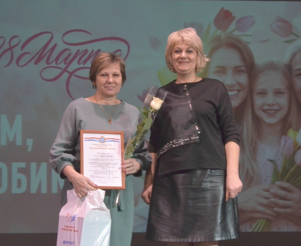 Кроме того, Благодарственных писем Самарской Губернской Думы за активную жизненную позицию, добросовестный труд, личный вклад в социально-экономическое развитие Самарской области и в связи с Международным женским днём 8 марта удостоились А. А. Анисимова, Л. Ф. Антонова, Е. В. Гусева, Н. А. Добровольская, О. А. Дунова, Н. П. Ерёмина, Т. А. Капустина, Ю. А. Коклюхина, Н. А. Козлова, И. С. Круглова, Р. М. Кубашова, Н. Н. Михайловская, Е. П. Морясова, А. А. Неборская, Т. И. Стеблева, Т. В. Титова¸ Е. В. Шальнова и Л. Ю. Шатрова.